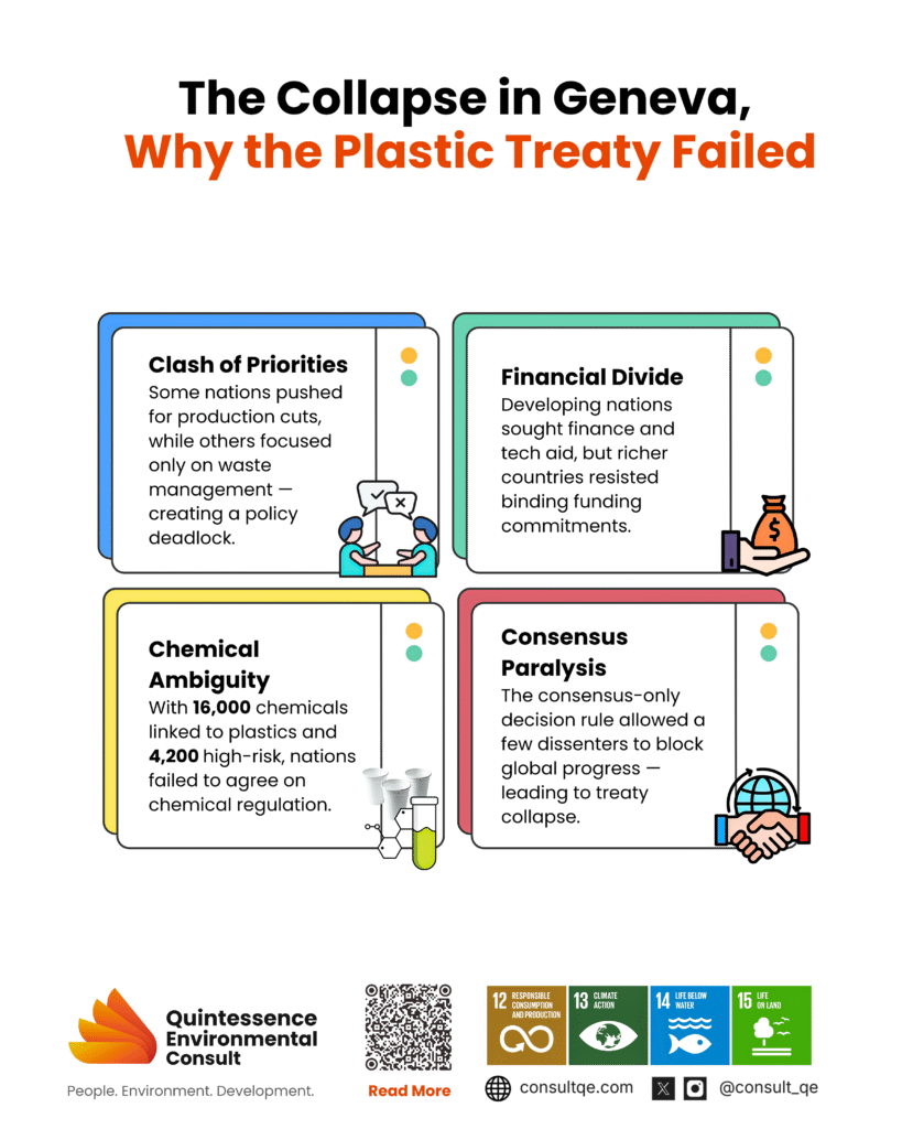The failure of the Intergovernmental Negotiating Committee (INC) to reach a unified position on the Global Plastic Treaty in Geneva in August 2025 leaves the international community without a legally binding framework to tackle the rapidly escalating plastic pollution crisis, revealing deep-seated divisions among member states. For Nigeria, this outcome poses significant challenges to its plastic waste management ambitions, particularly as it reduces access to crucial international support for funding and technology transfer; however, it simultaneously creates an opportunity for the country to strengthen domestic policies and rely on a robust, coordinated national strategy and regional cooperation to address its mounting plastic waste challenge. By strengthening national policies, formalizing waste management systems, investing in recycling infrastructure, and deepening regional partnerships through ECOWAS, Nigeria can chart an independent path toward a resilient circular economy—even in the absence of a global agreement.